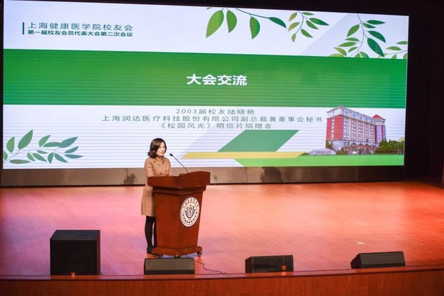 现任上海润达科技股份有限公司副总裁兼董事会秘书2003届校友陆晓燕分享了她成长历程,为感谢母校一直以来的悉心栽培,向大会捐赠纪念品一—《校园风光》明信片,衷心祝愿母校在黄校长的带领下,能在融合创新的道路上越来越好。
