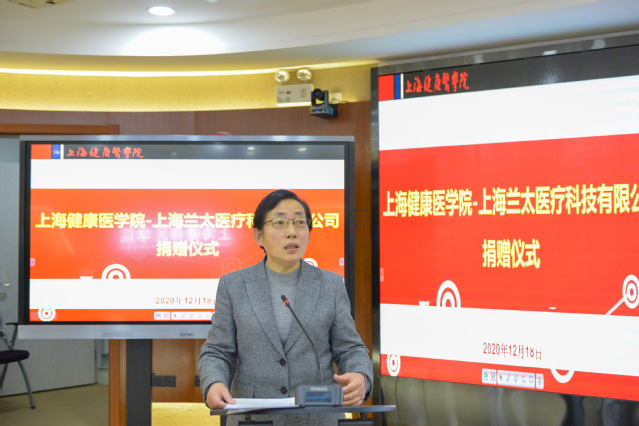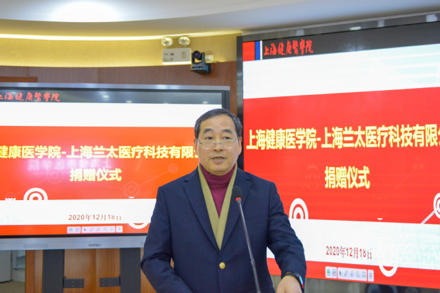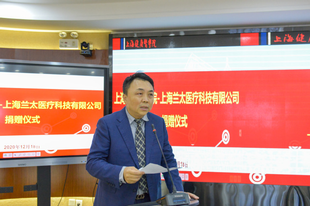 沈国芳副校长代表学校向上海兰太医疗科技有限公司嘉宾的莅临表示热烈欢迎,对公司的捐赠表示衷心感谢。学校诞生于“健康中国”新时代,秉承70年的办学历史,坚持“健康促进的使者,白衣天使的摇篮”和“医疗器械工程师的摇篮”的办学传统,紧密对接时代需求,立足服务经济社会发展需要,为新时代中国特色社会主义健康卫生事业发展培养了大量紧缺、创新型高素质人才。学校自觉引领社会文明,创新服务形式,全方位服务上海社会发展,在抗疫的战场上勇站前线,在不断提高服务能力和办学水平中提高了社会认可度。