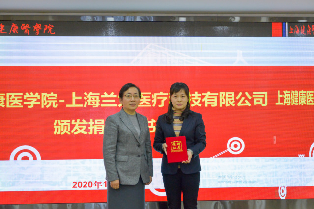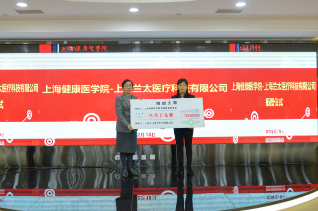 上海兰太医疗科技有限公司向上海健康医学院教育发展基金会捐资人民币50万元,设立“兰太医疗”奖学金/奖教金,以支持学校人才培养,奖励给医疗器械学院家境贫困品学兼优的学生以及优秀教师。郑沈芳理事长代表教育发展基金会接受捐赠,并为公司颁发捐赠证书。