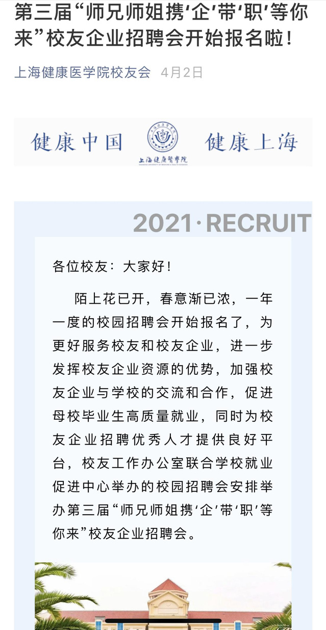 “浓浓母校情,拳拳学子”,每年都有一大批在各行各业积极进取、勇于创新,在为社会创造物质财富,为民众创造就业机会,具有社会责任感的优秀校友企业关心、支持母校的建设发展和学生就业创业工作,参加历届“师兄师姐携企带‘职’等你来”校友企业专场招聘会。今年夏天,上海健康医学院又走出了一批优秀的毕业生,为促进我校毕业生多渠道、更高质量、更充分就业,同时凝聚校友力量,加强与校友企业合作,为广大校友企业招聘优秀人才,服务校友企业更好发展,以及促进学校未来的可持续发展,我们诚邀校友企业招聘母校毕业生,为健康学子提供更多的优质岗位。
