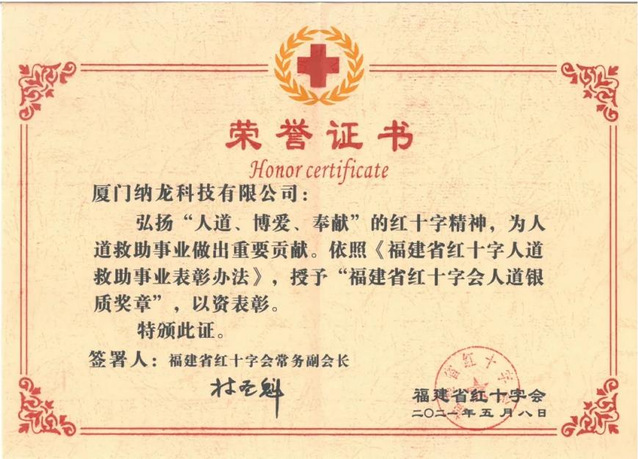 近日,福建省红十字会授予厦门纳龙科技有限公司(以下简称纳龙科技) “福建省红十字人道银质奖章”,以表彰公司在支持人道救助事业方面作出的积极贡献。