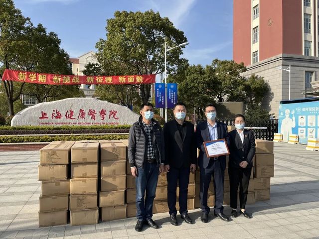 中国银行南汇支行行长吴朝昀,副行长马军;上海健康医学院党委副书记、纪委书记李明磊,党委副书记、副校长唐红梅和相关职能部门负责人参加中国银行防疫物资捐赠。