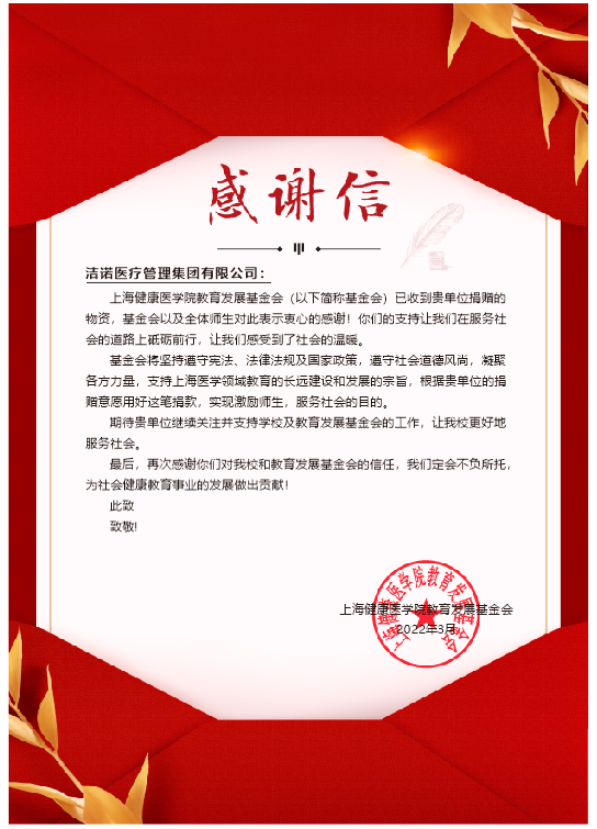 洁诺医疗管理集团有限公司为健康园送来的不仅仅是防疫物资,更是他们对师生们的深切关怀和问候。携手抗疫,共筑防线,每一份捐赠,都是一份抗疫的力量。