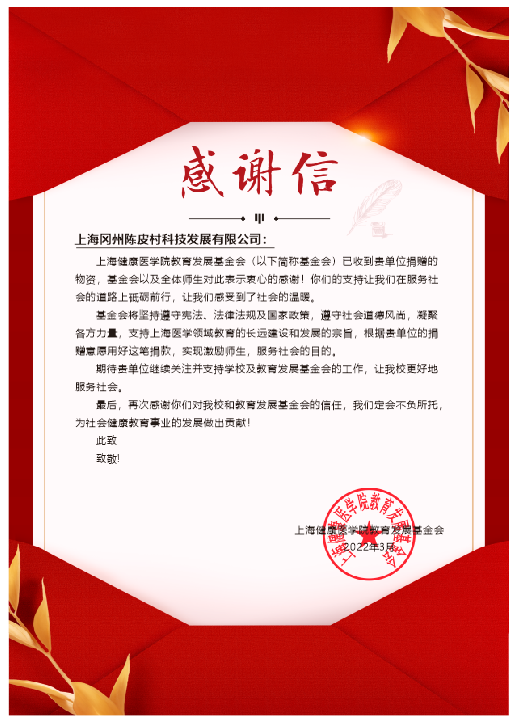 作为新会“陈皮村吴村长”品牌“上海总代理”的上海冈州陈皮村科技发展有限公司本着一缕陈香故土情,爱心助力健康园的深厚情谊助力我校疫情防控工作。
